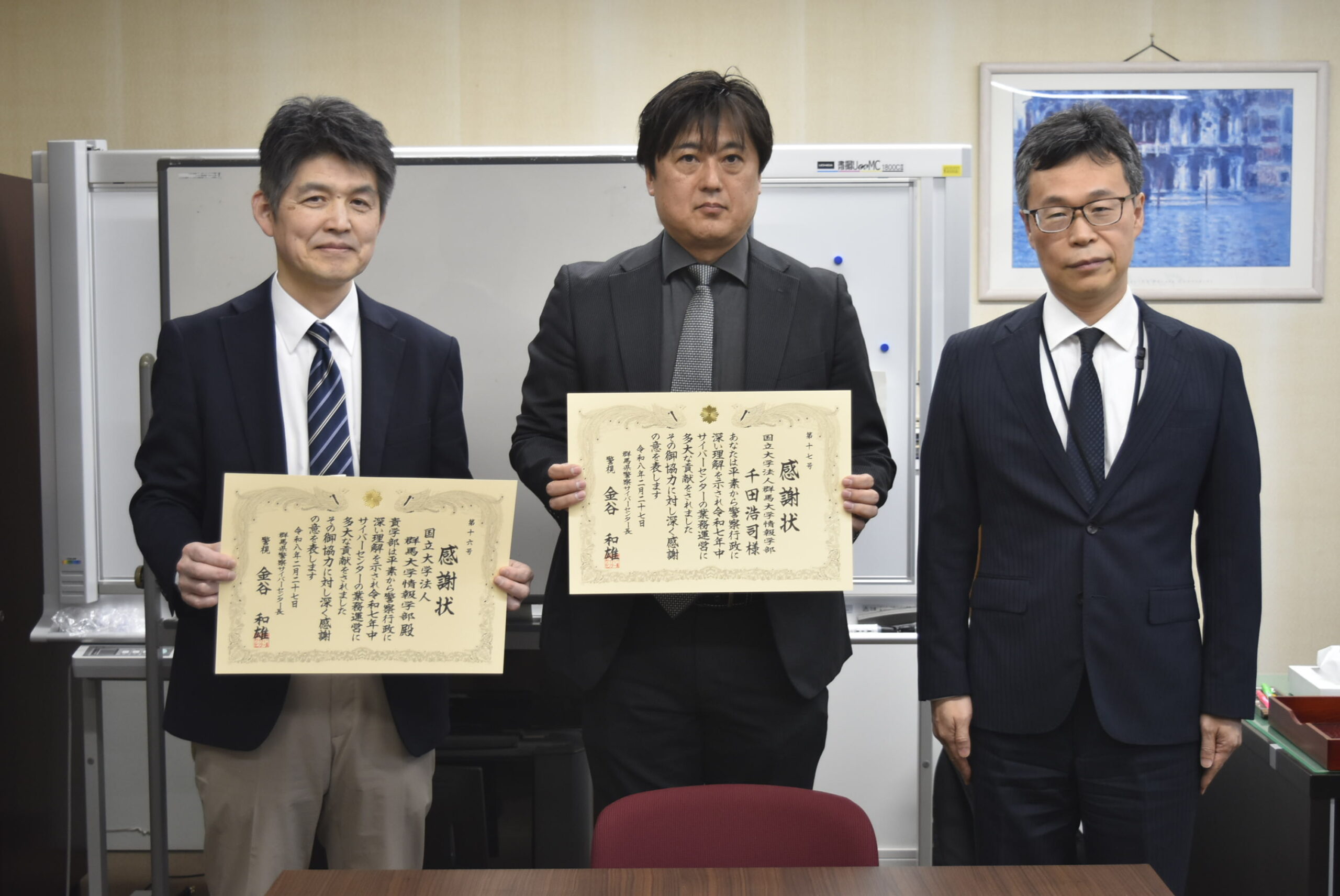 当日は伊藤賢一学部長及び千田浩司准教授が群馬県警察サイバーセンター長 金谷和雄 様から感謝状を受け取りました。